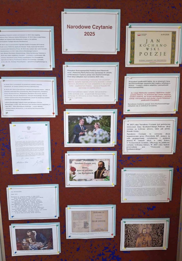 10 września nasza szkoła włączyła się kolejny raz w obchody Narodowego Czytania, polskiej akcji społecznej propagującej znajomość literatury narodowej. Tegoroczna edycja przeniosła nas w świat najwybitniejszego polskiego poety epoki renesansu, Jana Kochanowskiego. Uczniowie zaprezentowali wybrane Pieśni, Fraszki i Treny Mistrza z Czarnolasu oraz przybliżyli barwny życiorys poety i rolę, jaką odegrał w rozwoju polskiej literatury. Przedstawiciele naszej szkoły czytali również poezję Jana Kochanowskiego w Miejsko- Gminnej Bibliotece Publicznej w Lubrańcu.