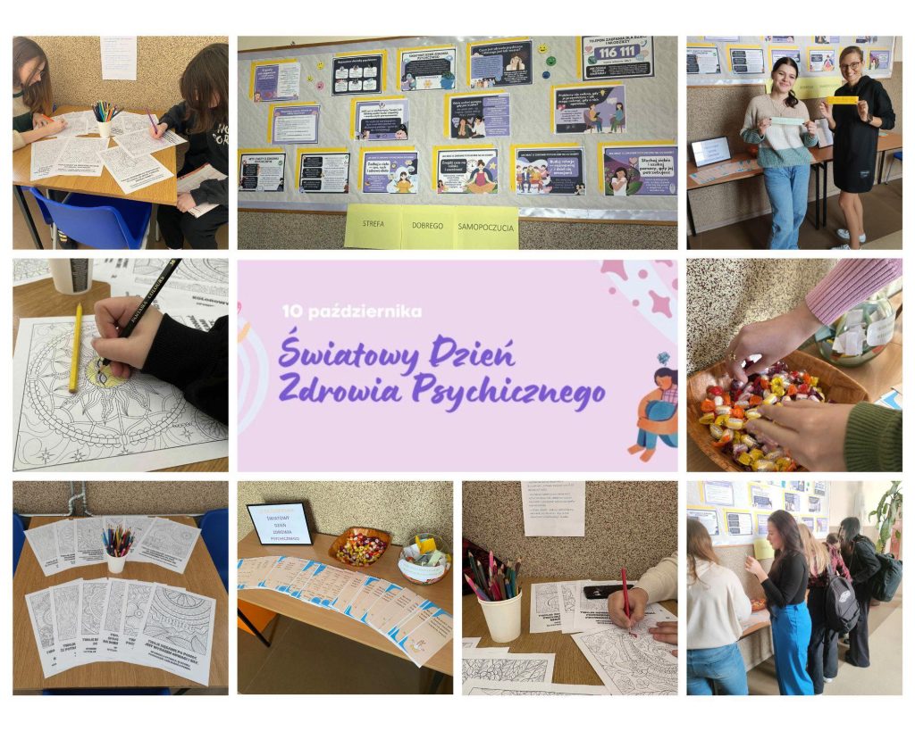 W tym dniu, w naszej szkole, również zaakcentowaliśmy znaczenie dbania o zdrowie psychiczne. Na gazetce szkolnej zostały zawieszone ważne informacje na temat zdrowia psychicznego, a na stołach czekały ulotki z informacjami, gdzie można znaleźć pomoc. Na korytarzach szkolnych, podczas przerw, uczniowie mogli korzystać z tzw. strefy dobrego samopoczucia. Mieli możliwość wylosowaniasentencji wspierającej ze „słoika pozytywnych myśli”, a do „słoika wdzięczności” mogli wrzucić karteczkę ze swoją myślą dotyczącą czegoś dobrego w życiu. Ponadto, w całej szkole, były przygotowane miejsca, gdzie można było zrelaksować się podczas kolorowania, które bardzo korzystnie wpływa na nasze zdrowie psychiczne.