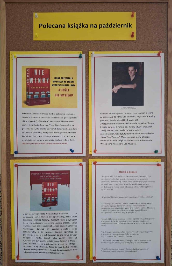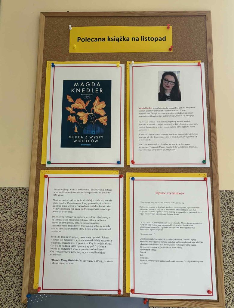 W ramach działań promujących czytelnictwo w każdym miesiącu nauczyciele bibliotekarze polecają książkę wartą przeczytania. Najczęściej są to pozycje zakupione ze środków pozyskanych w ramach Narodowego Programu Rozwoju Czytelnictwa 2.0 na lata 2021 – 2025. Akcja cieszy się dużym zainteresowaniem, zarówno wśród uczniów, rodziców, nauczycieli oraz pracowników szkoły!