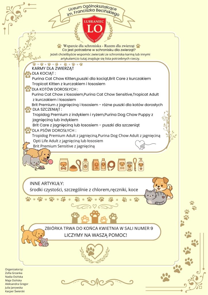 W ramach projektu z przedmiotu biznes i zarządzanie organizujemy zbiórkę karmy oraz innych artykułów dla schroniska dla zwierząt we Włocławku. W szkole zostały porozwieszane plakaty na drzwiach poszczególnych sal. Artykuły, które głównie zbieramy to m.in.