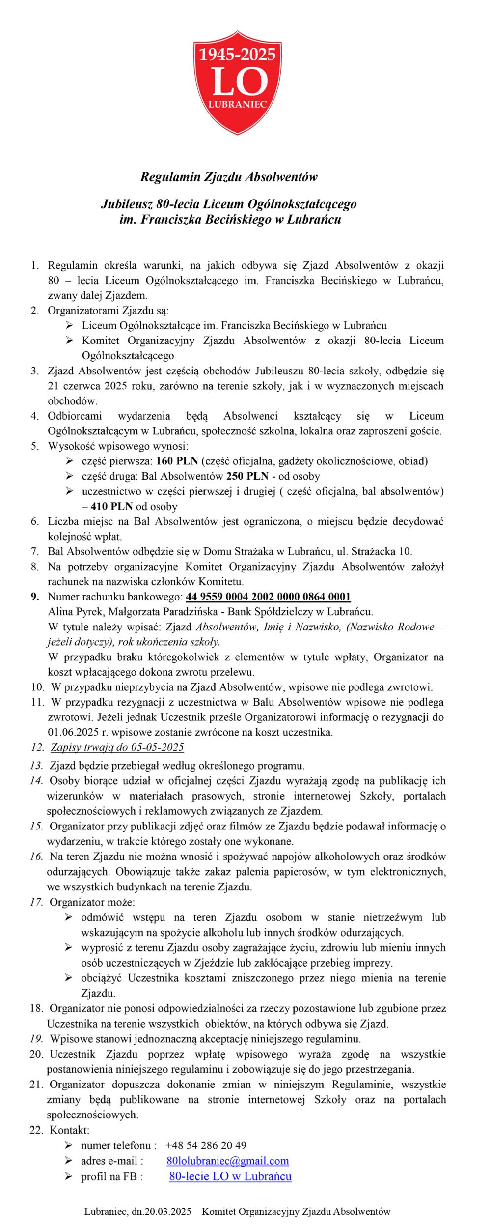 Za nami czas spotkań, wzruszeń i wdzięczności… Spotkanie po latach było pełne wzruszeń, śmiechu i niezapomnianych wspomnień. Dziękujemy za tak liczne przybycie, pozytywną energię i wyjątkową atmosferę, którą razem stworzyliśmy! Rozpoczynamy publikację zdjęć i filmów. Uchwyciliśmy najpiękniejsze momenty spotkań, rozmów, wspomnień z dawnych lat oraz wspólnej zabawy. Na rewersie Państwa identyfikatorów znajduje się kod QR, który będzie przenosił Was do wszystkich materiałów foto i video z tego dnia. Zaglądajcie tam koniecznie – może odnajdziecie siebie i swoich przyjaciół na zdjęciach z tego spotkania. Dziękujemy, że byliście. Do zobaczenia na kolejnych spotkaniach!